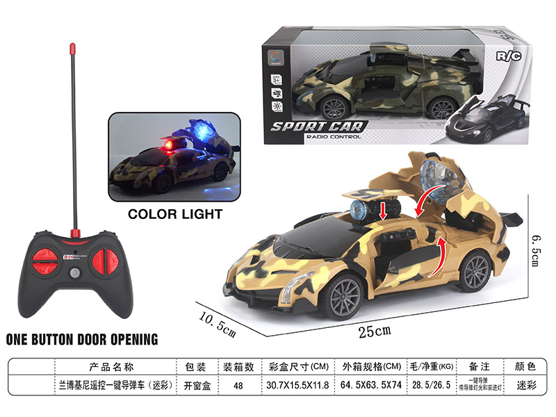 产品名称:迷彩兰博基尼五通遥控一键导弹车(迷彩) (色)(车身用3粒1.5V电池遥控器用2粒1.5V电池)