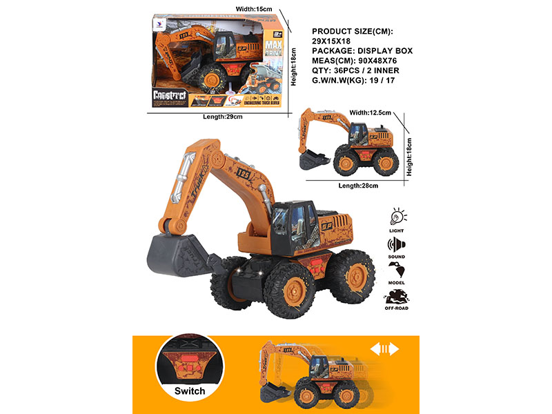 产品名称:仿真惯性挖土车(带IC灯光包3粒LR44纽扣电池)单款单色