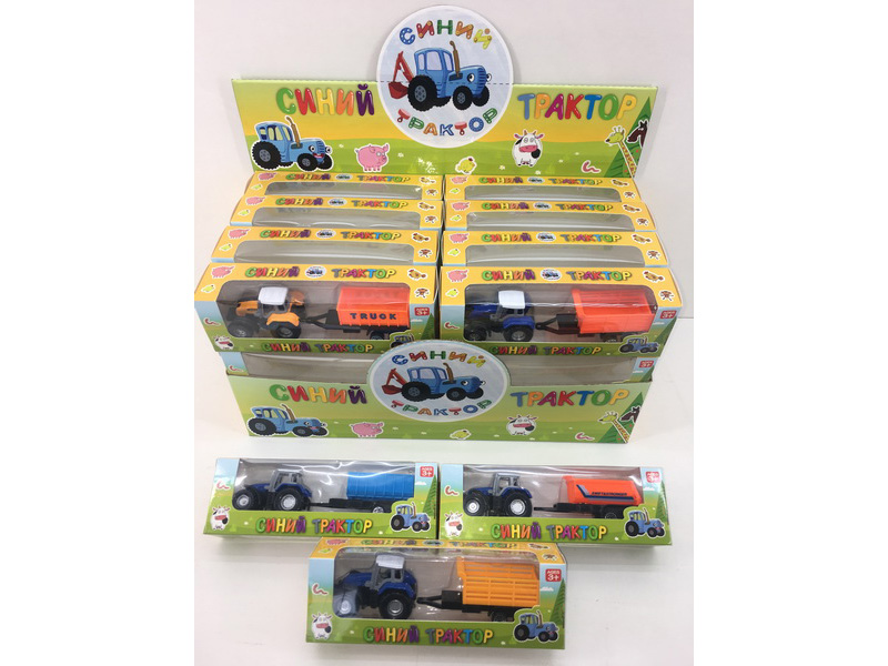 产品名称:(俄文开窗盒)滑行合金农夫车拖卡3款24盒装(车头蓝色,后面3款3色随机混装)
