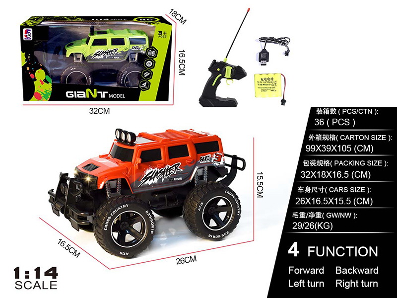 产品名称:1:14 带前灯悍马卡车四通遥控车(包电) (红 绿) 遥控车身电池信息: 包电4.8V电池组+USB 遥控器电池信息: 2*1.5V AA不包电