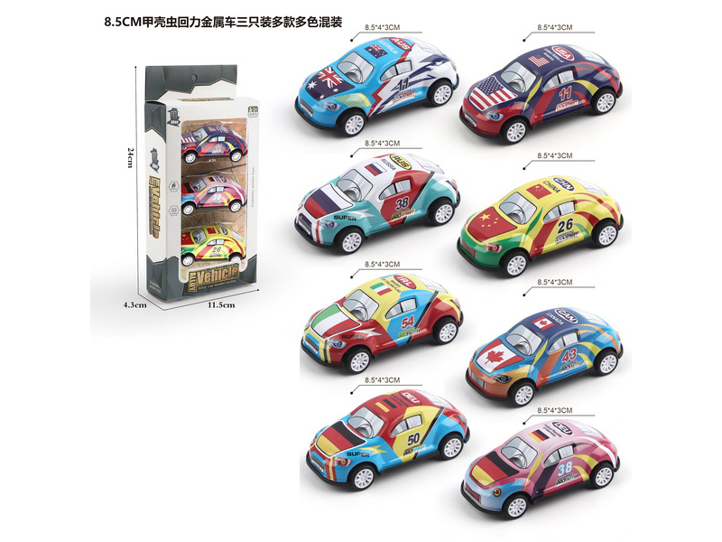 产品名称:3只庄8.5cm甲克虫回力铁皮车(多款多色混装)