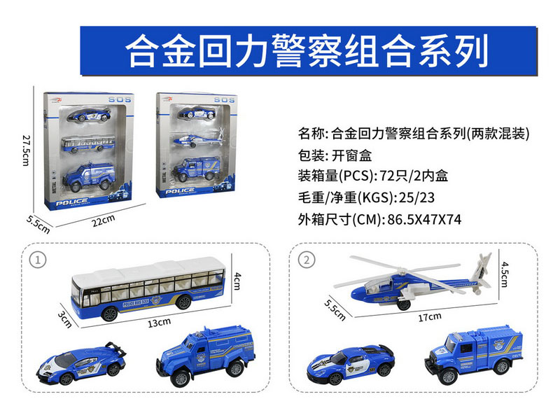 产品名称:(手提+PVC内垫)合金回力警察系列飞机车3款3只庄2盒混装